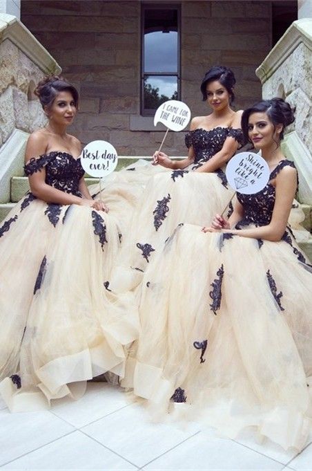 Elegant Off Shoulder Champagne Bridesmaid Dresses Garden Wedding Party Dresses Black Appliqued A Line Prom Wear Long Gowns Discount Bridesmaid Dresses Under 50 Fun Bridesmaid Dresses From Dressesgirl 96 06 Dhgate Com